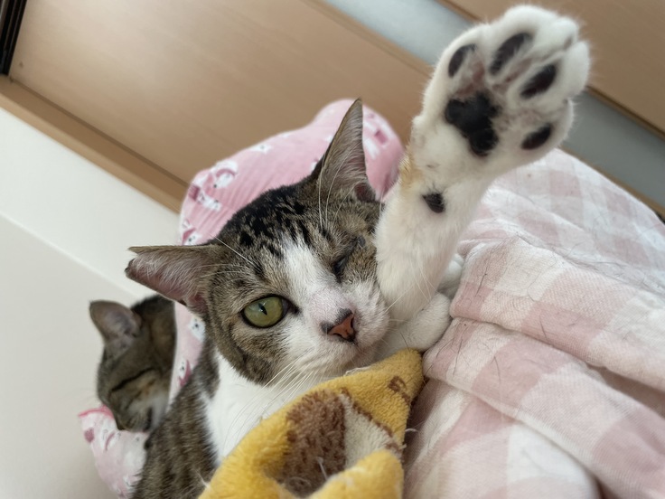 先に治療を終えたポン太くんと、伸び~~~をしてごはんを待ち焦がれています♪