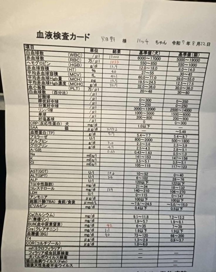 しかし、Cre(クレアチニン)の数値が1.1で、基準値1.9以下のため問題はないみたいです。
