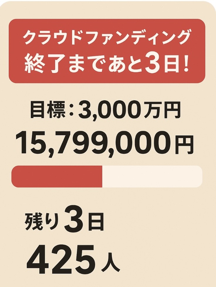 【クラウドファンディング終了まであと3日】たくさんの温かいご支援に支えられ、ここまで走ってくることができました。残り3日、挑戦のラストスパートです!