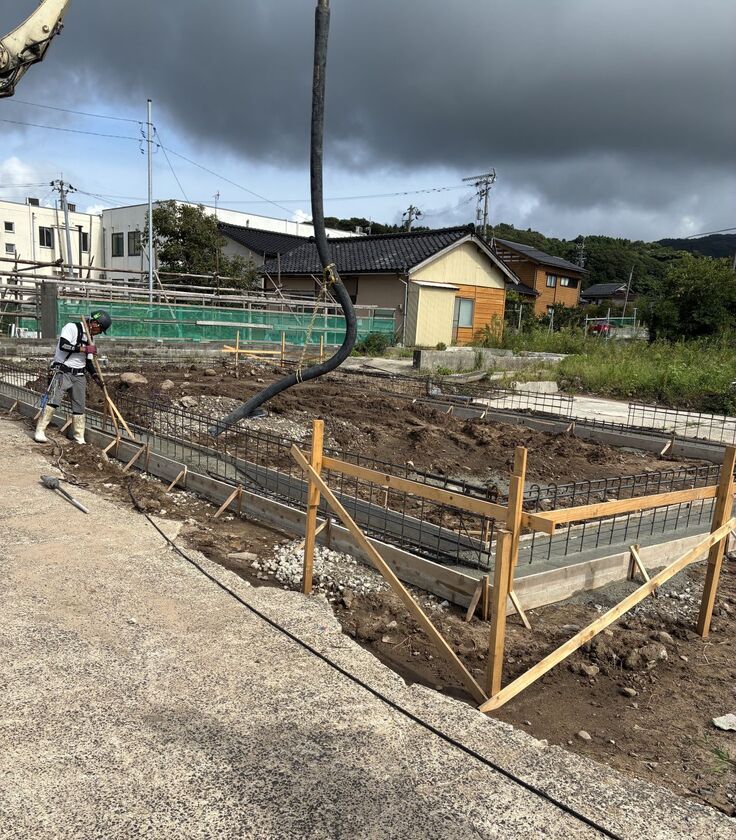 本日は基礎のコンクリート打設が行われ、建物の土台となる大事な工程が着々と進んでいます。