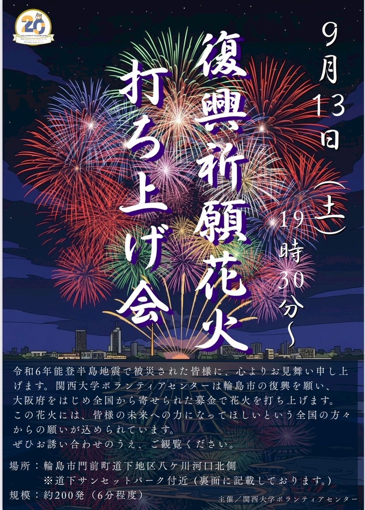 関西大学ボランティアセンターのみなさまが、関西で募金活動をしてくれて、門前で復興の花火をあげてくれました。