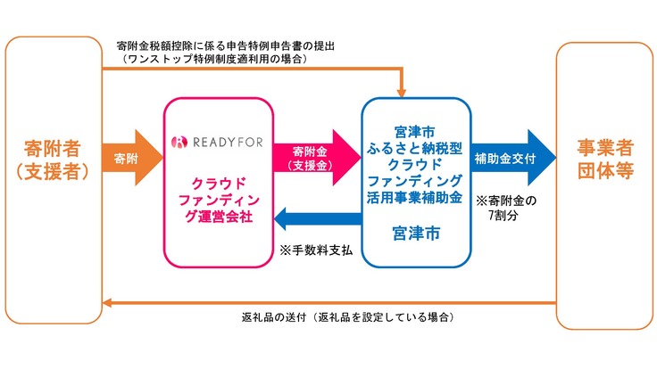 寄附金は宮津市がふるさと納税として領収し、その寄附金から経費等を差し引いた金額で補助金として事業者に交付します。