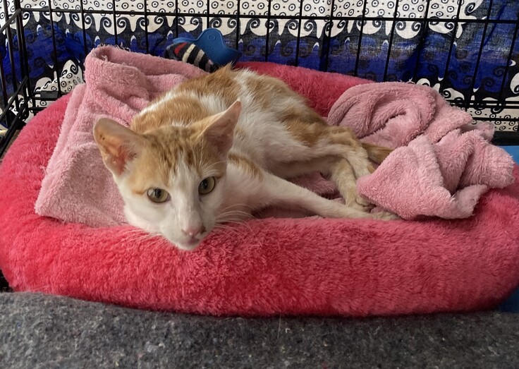 ナイロビ猫サンクチュアリ(Nairobi Feline Sanctuary)の移転前のシェルターに、やせ細った一匹の猫がいました。保護されて間もない猫で、体つきからすると生後5〜6か月ほど。しかし身体は骨と皮ばかりで、歩き方はヨタヨタと不安定。それでも意識はしっかりしており、必死に生きていました。でも猫風邪もひいているらしく、くしゃみが止まりません。ミャオ―の声もほとんど聞こえません。