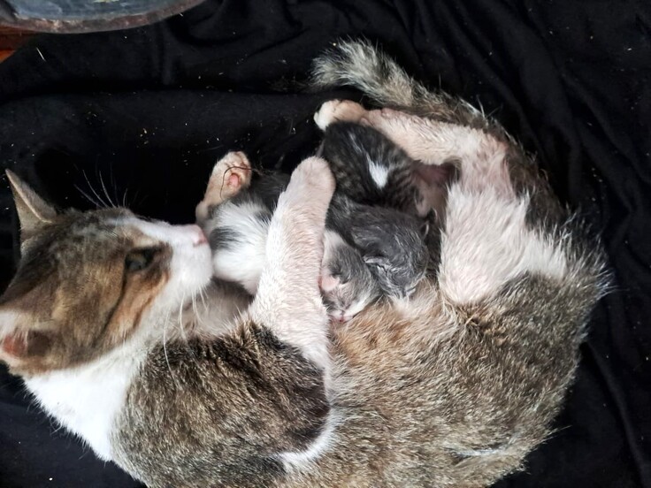 昨日、Nairobi Feline Sanctuary の移転前のシェルターに隠れていた母ネコから4匹の小さな命が誕生しました。母ネコはまだ7~8か月の若い猫で、これが初めての出産でしょうか。
