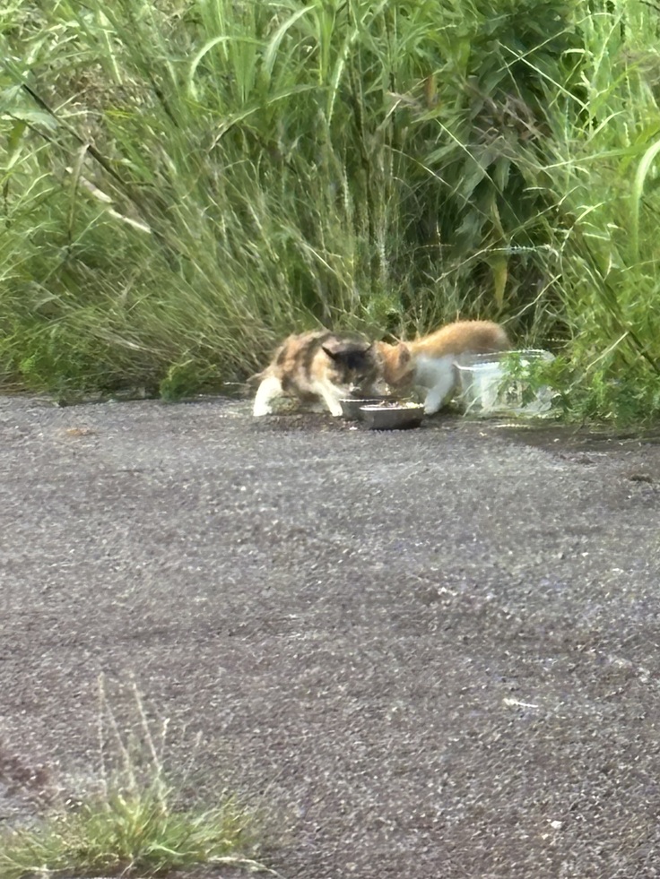そして、チャーがよく言い聞かせたのか、始め仔猫達は歩道脇の下にある畑の草むらに隠れて、チャーが呼ぶまで出てきませんでした。