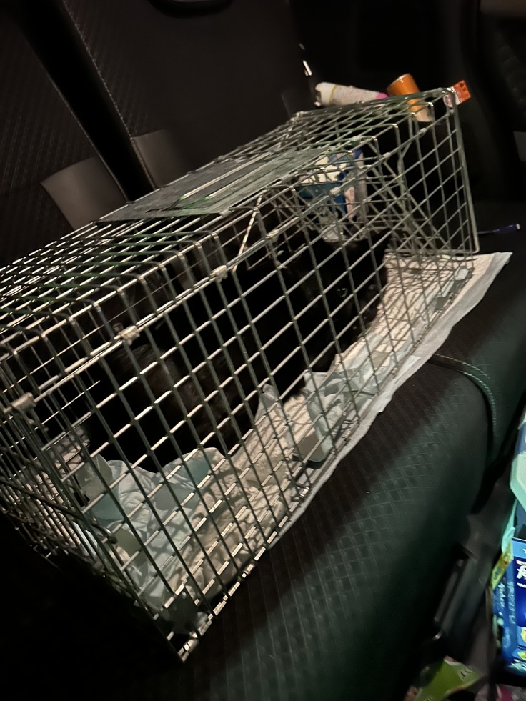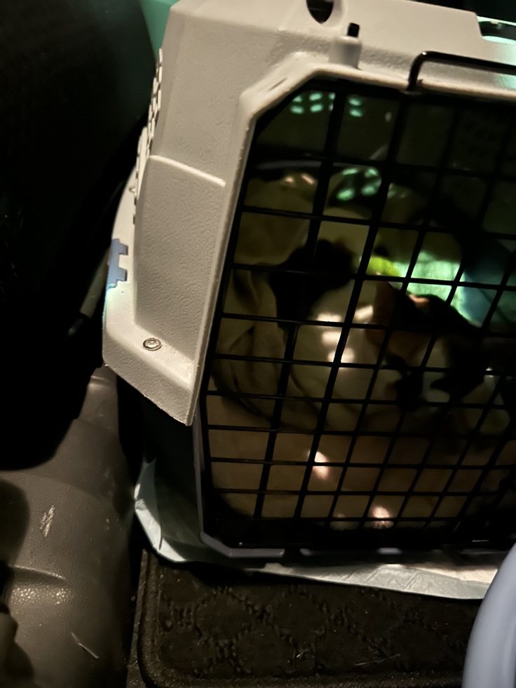 今日は仕事が気持ち早く終わって相方に頼まれてた捕獲を手伝いに行ったのだけどなかなか警戒心強く手こずって、とりあえず捕獲機を設置して一度解散して家に向かっていたらいつも餌やりしている6ヶ所のウチの1ヶ所に寄ると伊達ちゃんがもう待っていたので車に乗せてるご飯をあげようと近づくと左後ろの足が痛いのか腰からペタンペタンと倒れるので慌てて捕獲機を取って来て捕獲💦