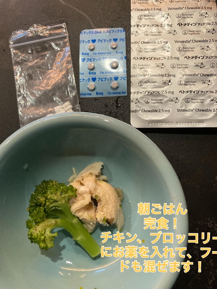 今朝のクッキーは、夜中に雷が鳴っていた事もあり、少し寝不足で…ご飯の用意をしていても寄ってこなかった為、先にお薬を鶏肉とブロッコリーと混ぜてのませました。その後ドライフードも混ぜてあげましたが、見事完食してくれました!