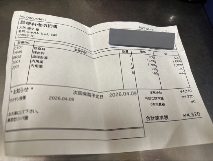 先送り1回目の明細(リンパ球数が足りなかったため) 8/10