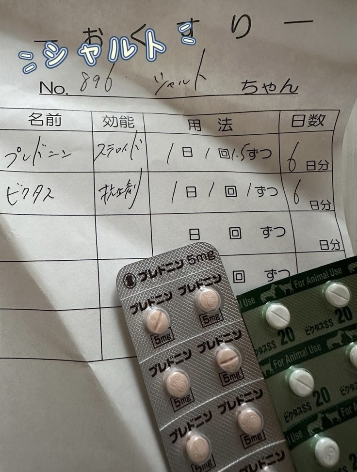 お薬はステロイドのプレドニンと抗生剤のビクタスが処方されました。
