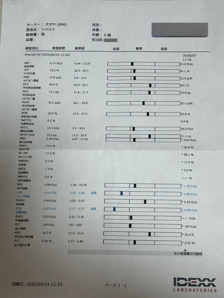 今回も抗がん剤治療の副作用である骨髄抑制によって、リンパ球数などが正常値より低値になってしまっていましたが、抗がん剤を投与するのには問題ない数値でした。