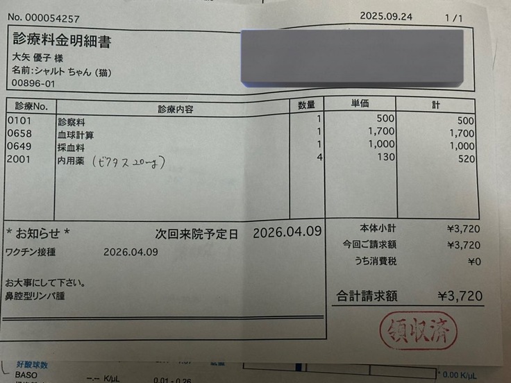 本日、シャルトは8回目の抗がん剤投与予定で通院しました。
