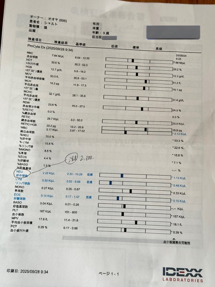 血液検査をして好中球数が1500個から2300個まで増えていました。