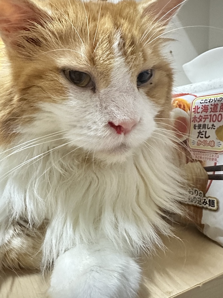 急いで清浄綿で鼻の粘膜を刺激しない程度にちょんちょんと軽く拭いてから、獣医さんにも鼻血の程度を診てもらう必要があるので写真を撮りました。