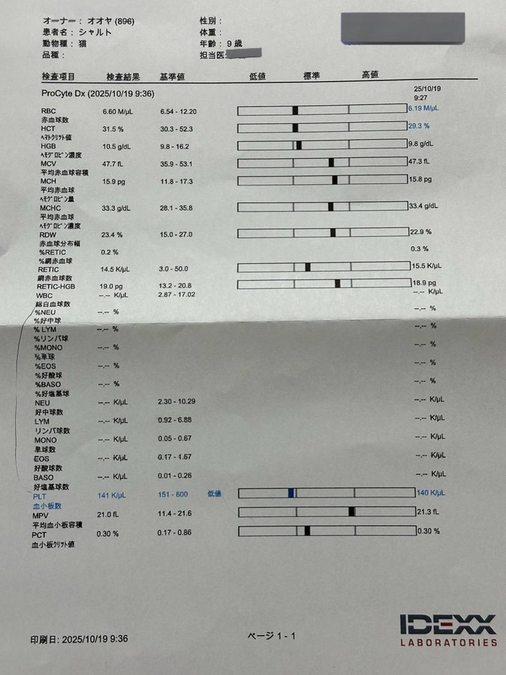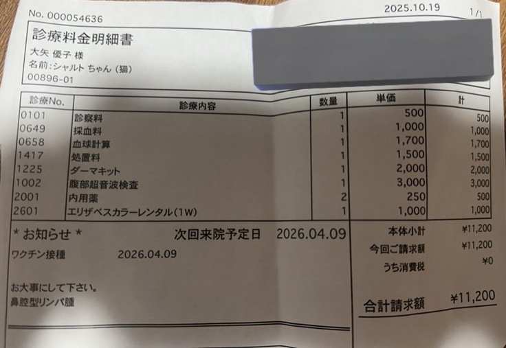 シャルトは10月19日日曜日に抗がん剤投与後の血液検査のため通院しました。