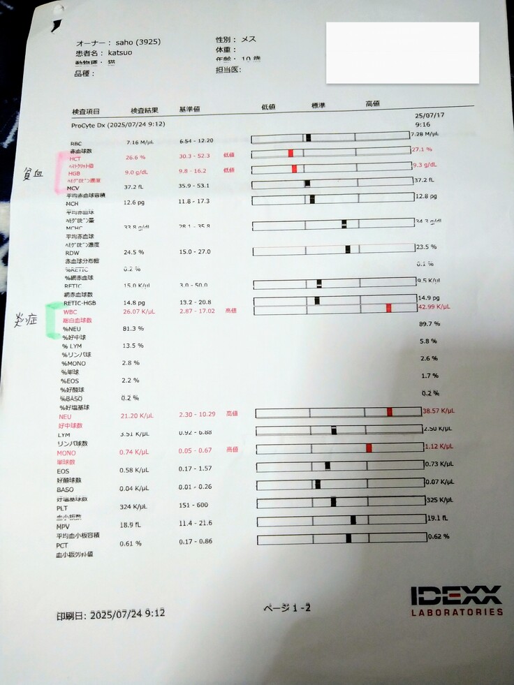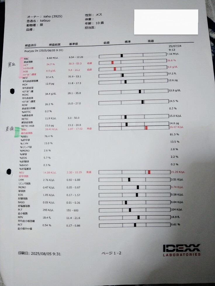 炎症数値(SAA)も前回の検査時56.72だったのが、今回16.45と大きく下がっていました。(正常値は5以下程)