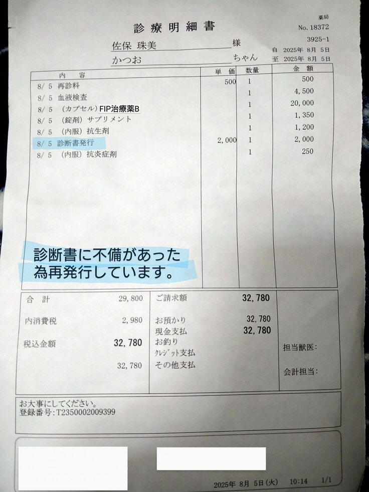 食欲がでてきたのと、ステロイドの影響で食欲が増しているため、体重が2.95kgから3.3kgに増えました。それに伴いFIP治療薬の量が増え金額も上がっています。