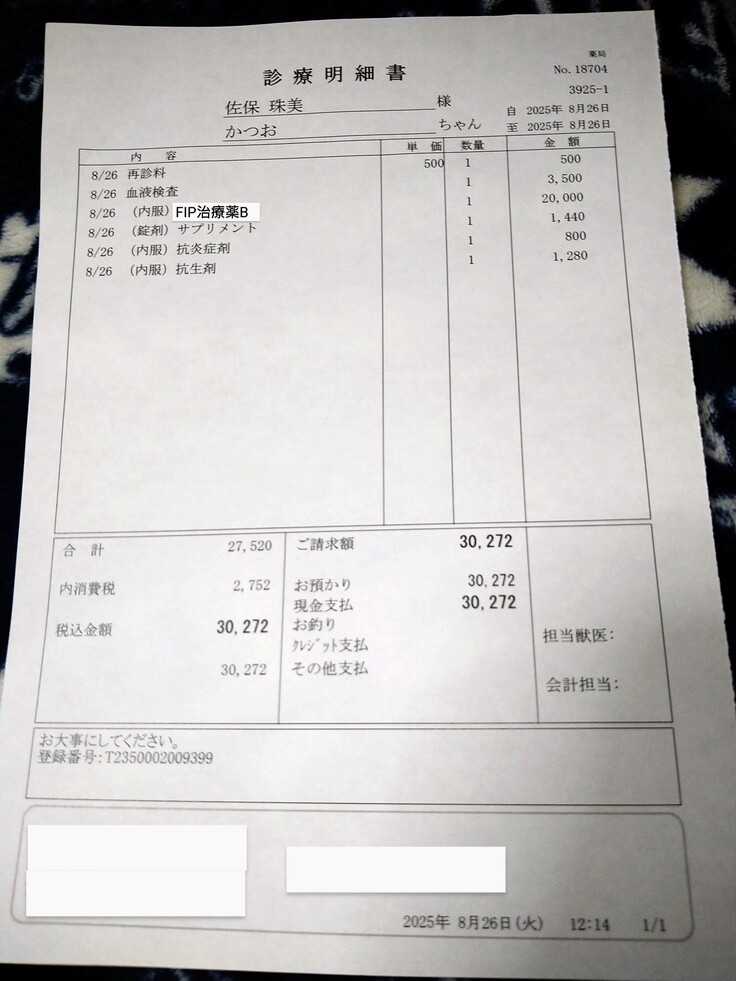 しばらくはステロイドと、このままFIP治療薬Bを併用して飲ませる事になりました。