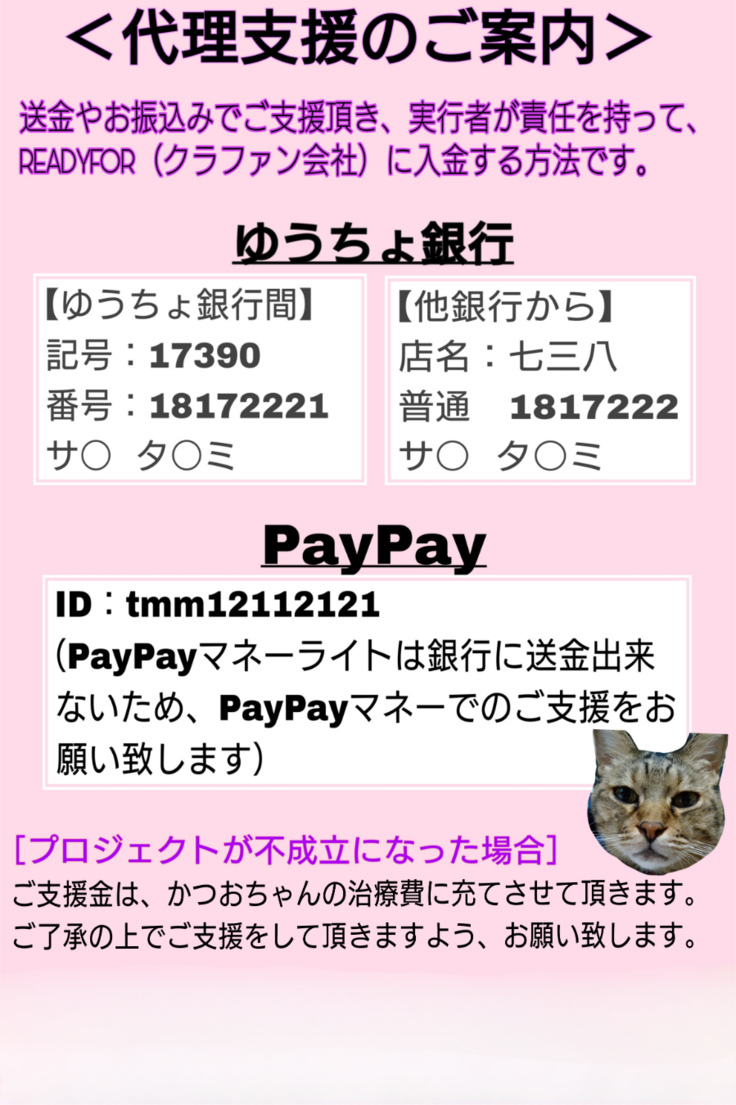 ※お手数ですが代理支援を頂きましたら、振込名・支援金額をメールにてお知らせください。