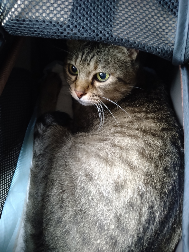 (↑車の中で診察待ちのかつおちゃん。最近、検温と採血が嫌になってきたみたいです)