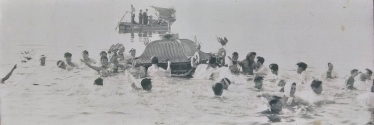 最後に、ぜひ来ていただきたいのが5月3日の春例祭です。武者行列、稚児行列、あばれ太鼓があるので、多くの方が見物に訪れられますが、マニアックな方へのお勧めは、大型の御鳳輦です。この豪華な御鳳輦は、伝承はあるものの確かなことは解っていません。宵宮と本日のみ公開されます。かつては、若者30人以上が担いで湖岸や琵琶湖の中を練り歩きました。豪華な飾りのついた神の乗り物を手荒く扱ってよいのかと思われますが、「みあれ」といって、荒々しく扱うほど神の力強い再生がかなうと考えられ、黙認されていました。その時の写真が残っています。今ではあまりに大きく重いため、動かすことができません。