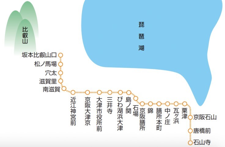 ■京阪石坂線(正式名称:京阪電気鉄道石山坂本線)は、大津電車軌道株式会社により1913(大正2)年3月1日大津(現・びわ湖浜大津)―膳所(現・膳所本町)間が開業したのが始まりです。その後、順次路線を伸ばし1927(昭和2)年9月10日現在の姿である坂本(現・坂本比叡山口)―螢谷(現・石山寺)間が開通しました。路線長14.1kmを、片道30分余りで運行。利用者は一日3万数千人。朝夕は通勤通学の足として、昼間は市民のかけがえのない足として、2両編成の各駅停車のかわいい電車がコトコトと走っています。 地元では、「いしざか線」「いっさか線」と親しげに呼ばれています。