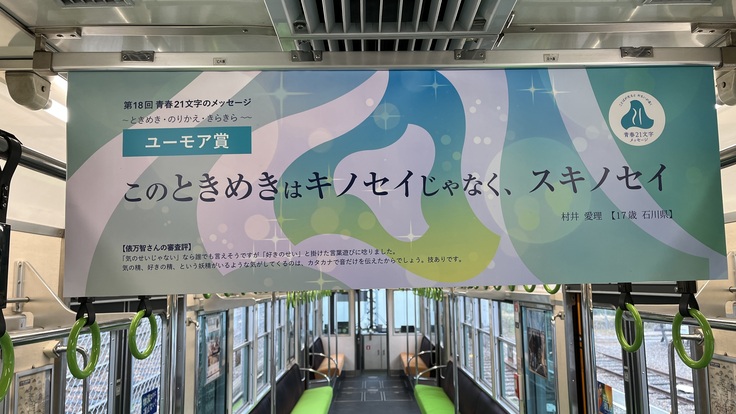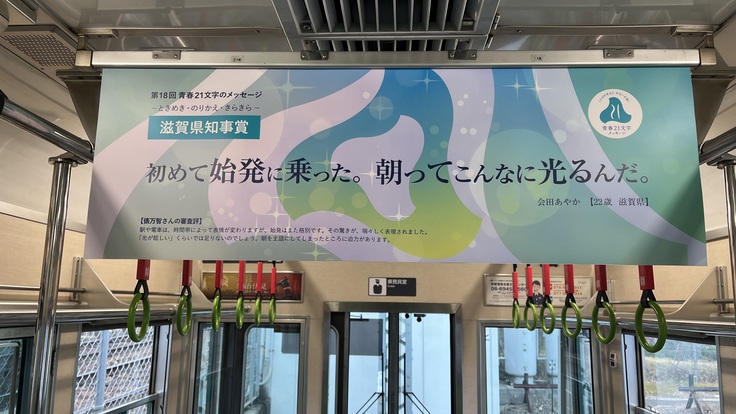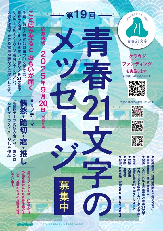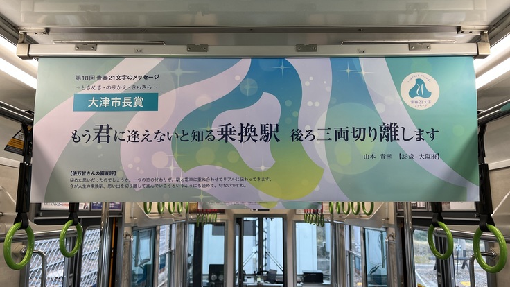 わたしたち「電車と青春21文字プロジェクト」は、公共交通を舞台に、ことばの力で地域の魅力を発信する市民グループです。琵琶湖に沿うように滋賀県大津市の中心部を走る京阪電車石坂線(石山坂本線)。沿線には学校が多く、朝夕には制服姿の中高生であふれます。「石坂線って青春っぽい」。だれかれとなく出てきたそんな言葉から、「青春21文字のメッセージ」は生まれました。「21」は石坂線の駅数に因んでいます。2006年に第1回を開催。今回が19回目となります。スタートは、京阪電車でしたが、回を重ねるごとに滋賀県内の鉄道全社も加わり、テーマが「青春」であることから、通学電車に結びつき、応募者の半数が10代の若者であるというユニークな事業に育ちました。