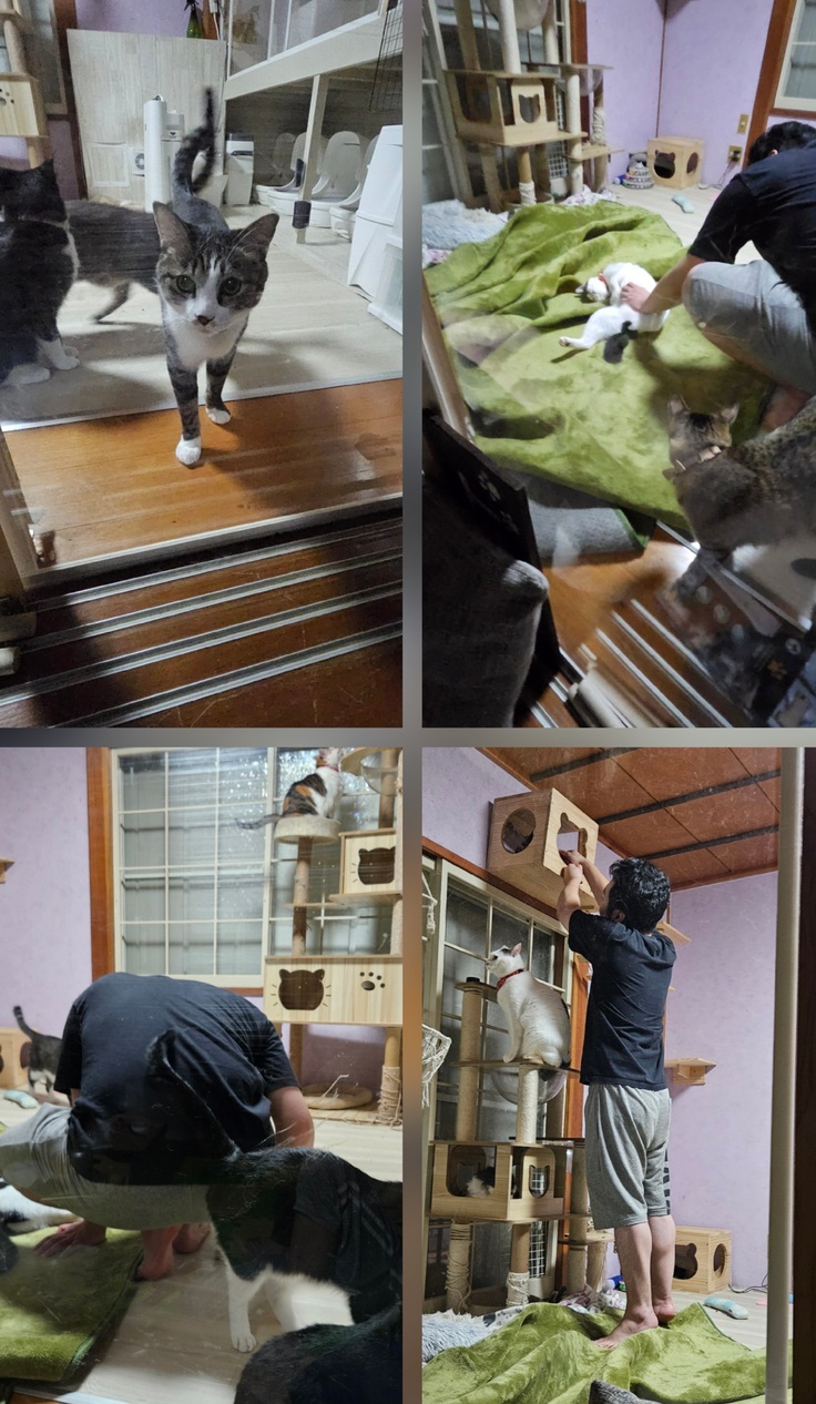 4:00過ぎ猫たちのご飯、お部屋のお掃除…今日もおはぎちゃん脱走しようと必死です!