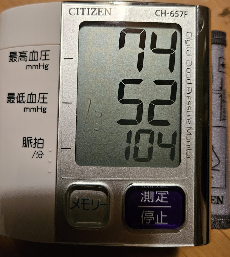 今朝の私の血圧、動いてなくても少し脈が早く、血圧もかなり低くなっております