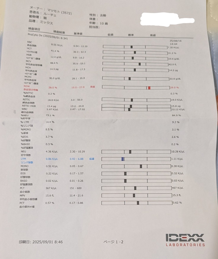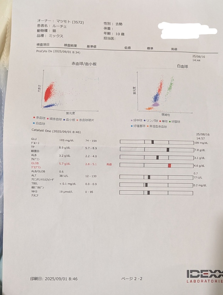 グロブリンと赤血球が上がり リンパが下がっていますが少しなので問題ないそうです。