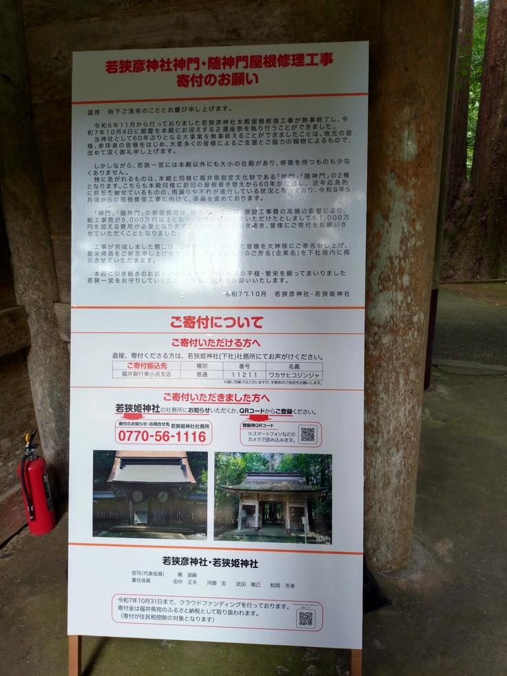 また、本殿修復工事に引き続き、神門・随神門の工事を予定していることから、随神門に皆様へご協力をお願いする看板を設置いたしました。