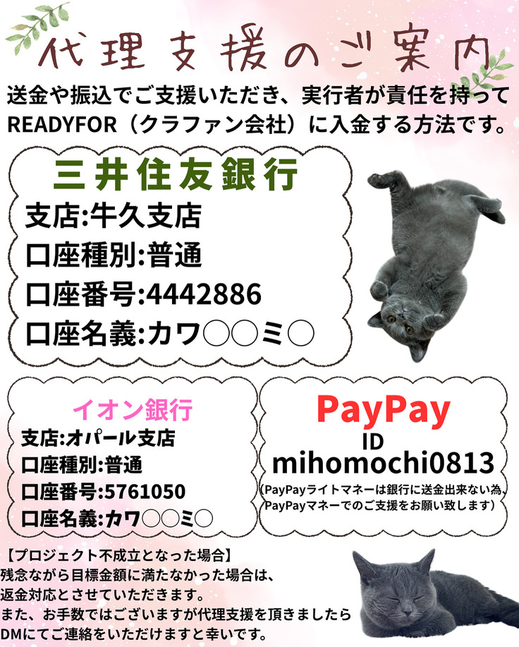 クレジットカードをお持ちでない方、レディーフォーへの登録が難しい方に送金、振込でご支援いただき実行者がクラファン会社に入金する方法です。