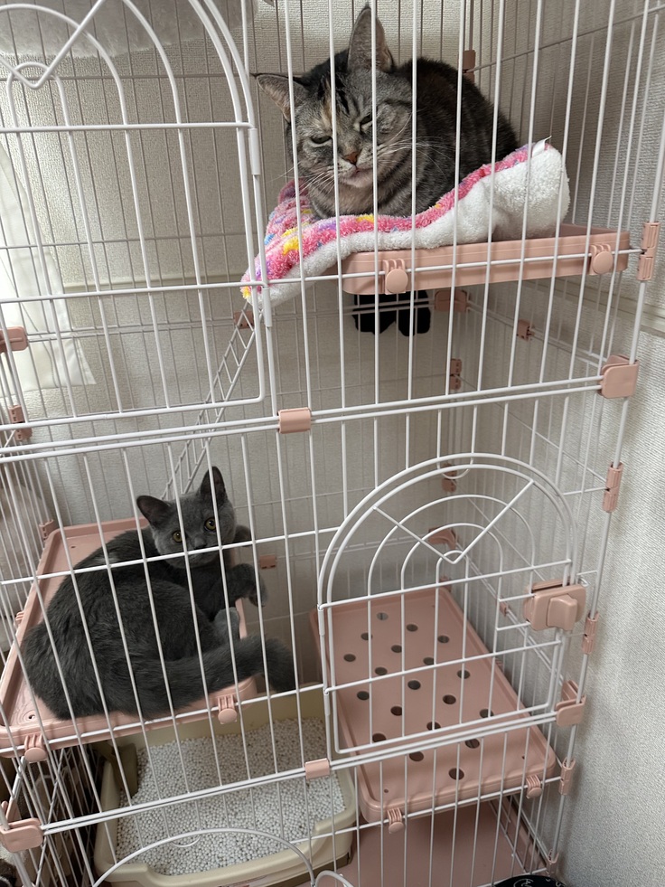 最近新調したケージで先輩にゃんに怒られながらも遊んでいます。