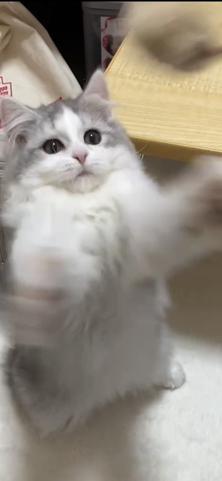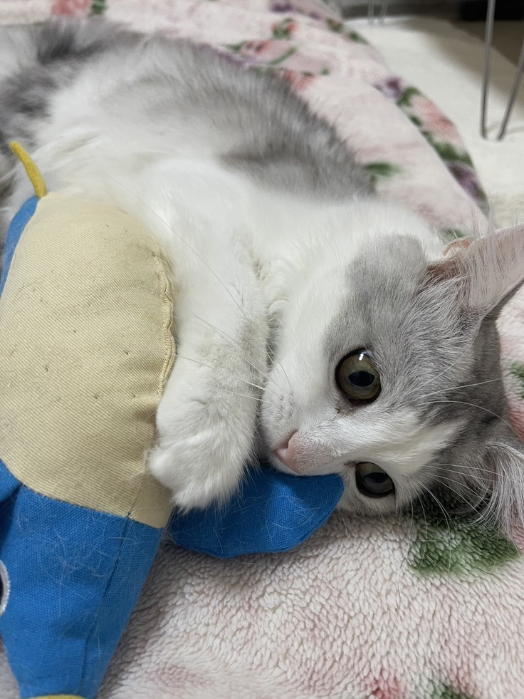 遊びが大好きで、猫じゃらしを出したら、いつもお目目をキラキラさせて遊んでくれます。