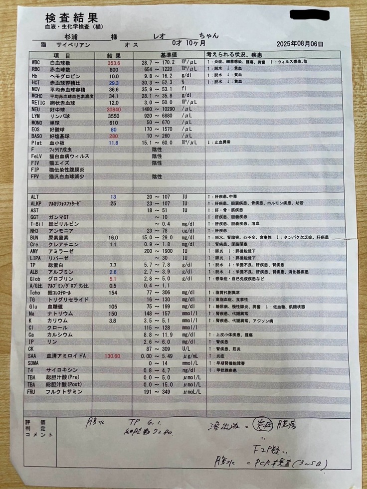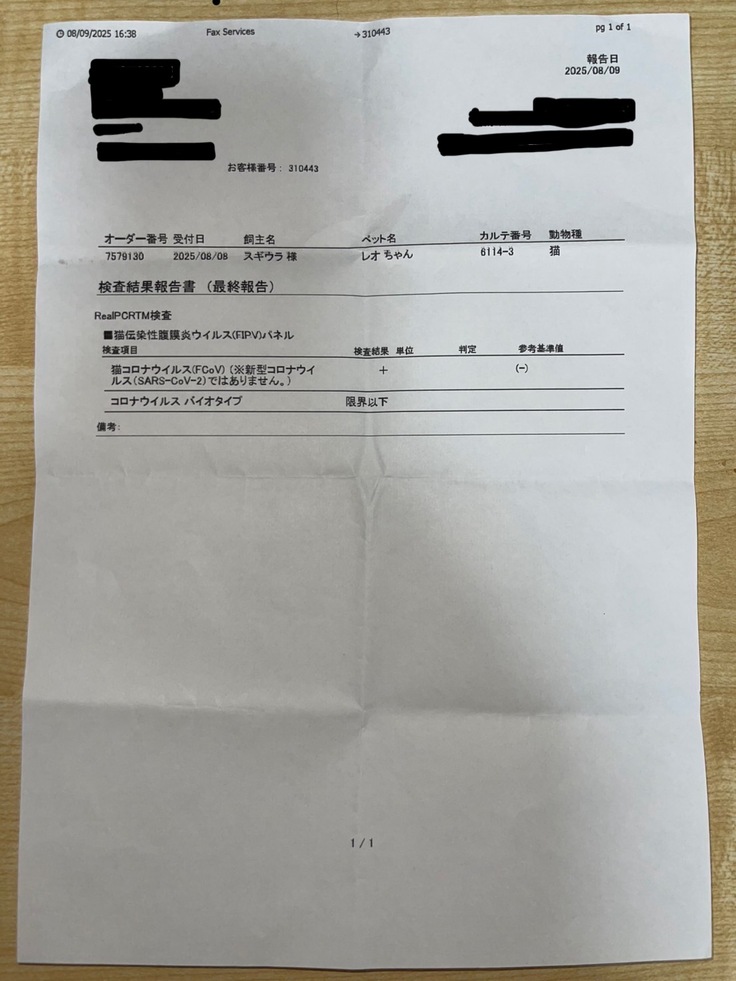 FIPは進行が早く、外部の機関の検査結果を待ってから薬を投与してた場合、薬の効果が間に合わず死亡してしまう可能性があるとの事でした。