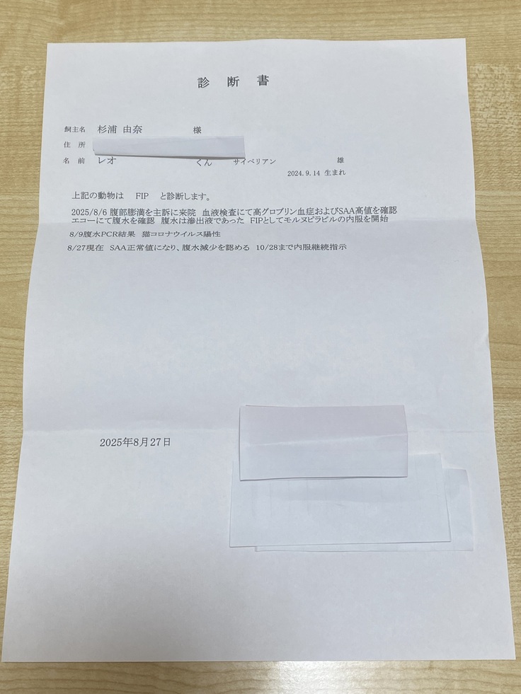 我が家の愛猫レオちゃんがFIPという病気にかかってしまいました。