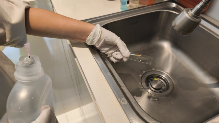 綿棒で採取。しかし量が少なく原因が特定されず、薬の処方だけでした。
