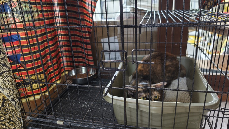 昨夜からケージで隔離しています。