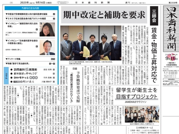 16日発刊の日本歯科新聞の1面に、当協会の活動が掲載されました。