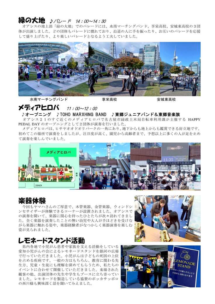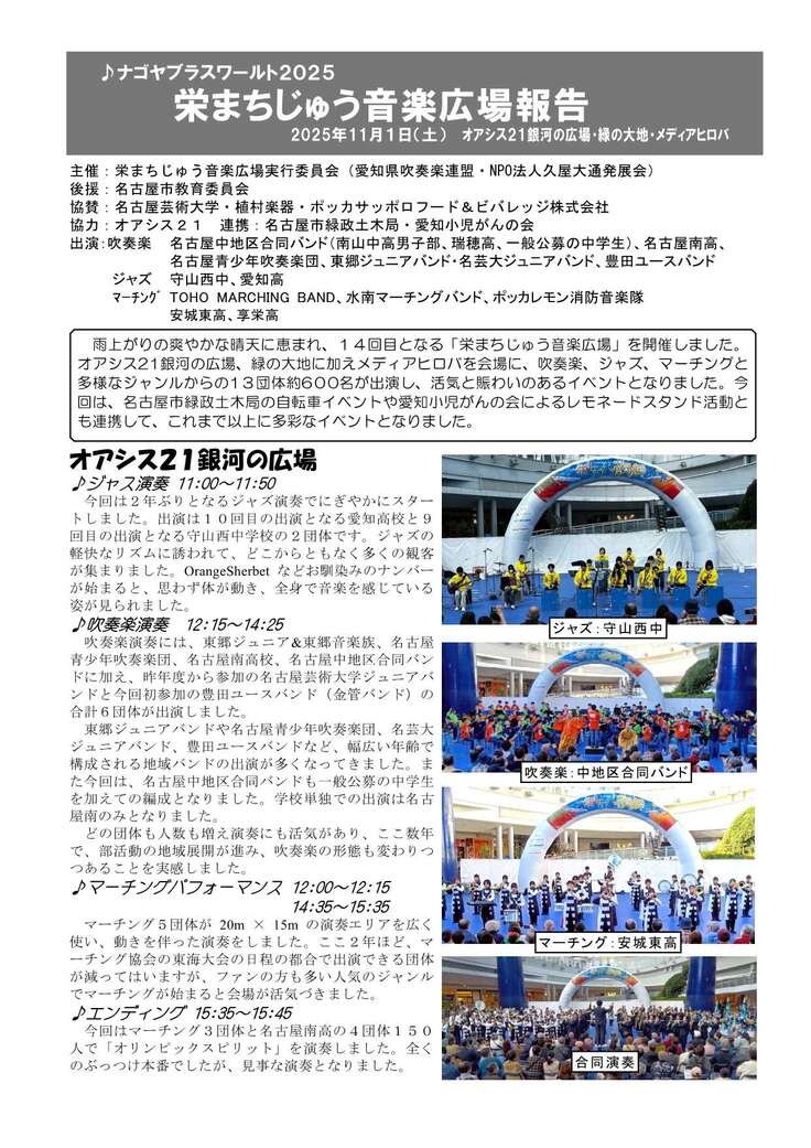 当日(11月1日)は、秋らしい晴天に恵まれ、予定していたすべてのプログラムを実施できました。小中高生を中心に13団体600名が参加し、大勢の観客の前で演奏・演技を披露し、メディアヒロバでの演奏や小児がん支援のレモネードスタンド実施など新たな取り組みも成功し、栄の街に賑わいを取り戻すことができました。