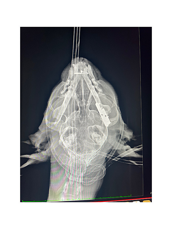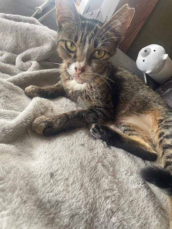 ↑退院後です。骨折した際に舌に穴が開いてしまい縫合していただきました。数日はチュールのみが主食です。
