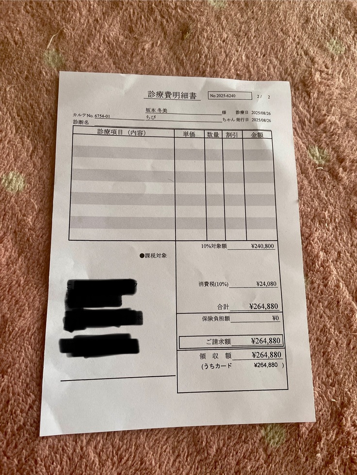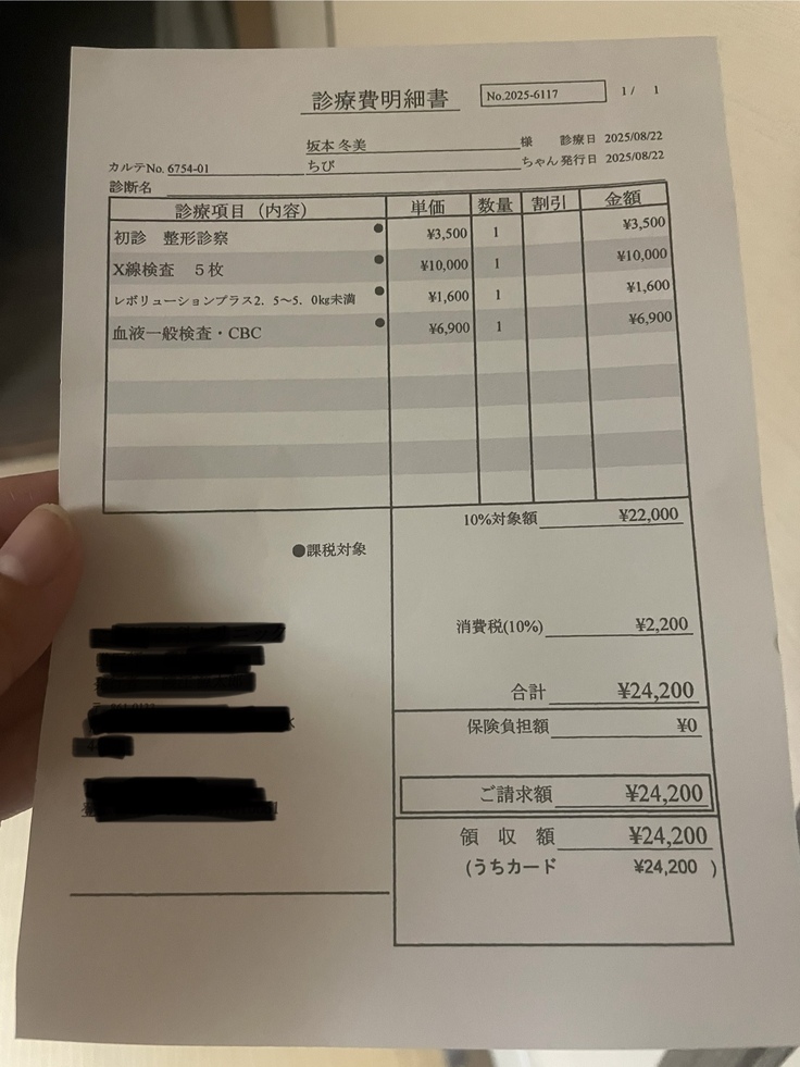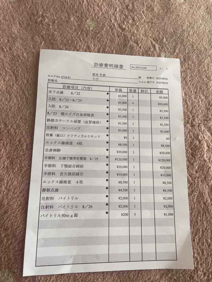 お世話になっている動物病院の先生からは承諾を得て明細書はお載せしております。
