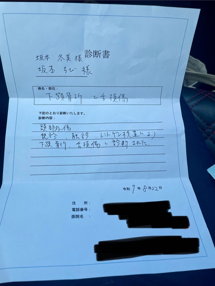 病院の先生によると、噛まれたのではなく事故で下顎を骨折していると聞かされました。