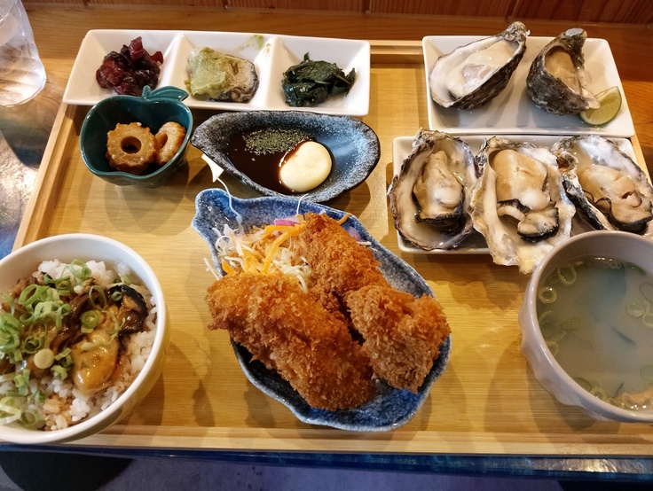 まさに、牡蠣づくし 生牡蠣、蒸し牡蠣、牡蠣フライに牡蠣飯が食べられてコスパ最高です。