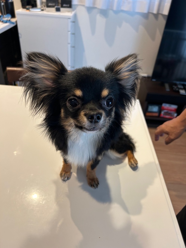 面会の部屋に連れてこられたゆむ君は手のひらに乗るぐらい小さく、机の上の片隅でプルプルと震えていました。そんな様子のゆむ君を先住犬がいる我が家に迎えて良いものかと不安がよぎった瞬間、ブリーダーさんから「実はゆむ君は一人っ子で、4日前に生まれたチワワ5兄妹と一緒のサークルで生活していて、その中でも特に北斗君とはすごく仲良しなのでちょっと北斗君をここに連れてきますね!」との一言。