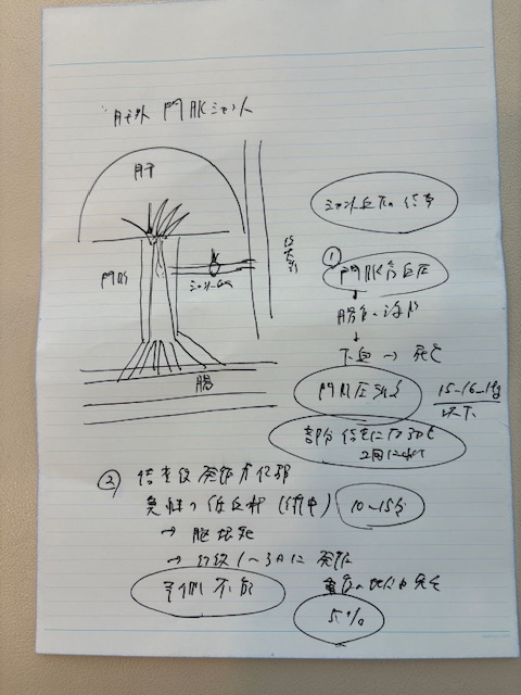 門脈高血圧症とは、手術中は器械を使って門脈圧の管理を行いますが、シャント血管を結紮し閉鎖することにより一気に大量の血液が門脈を通り、血管が肥大し、最悪の場合には大量出血し亡くなる場合もあるとのことでした。