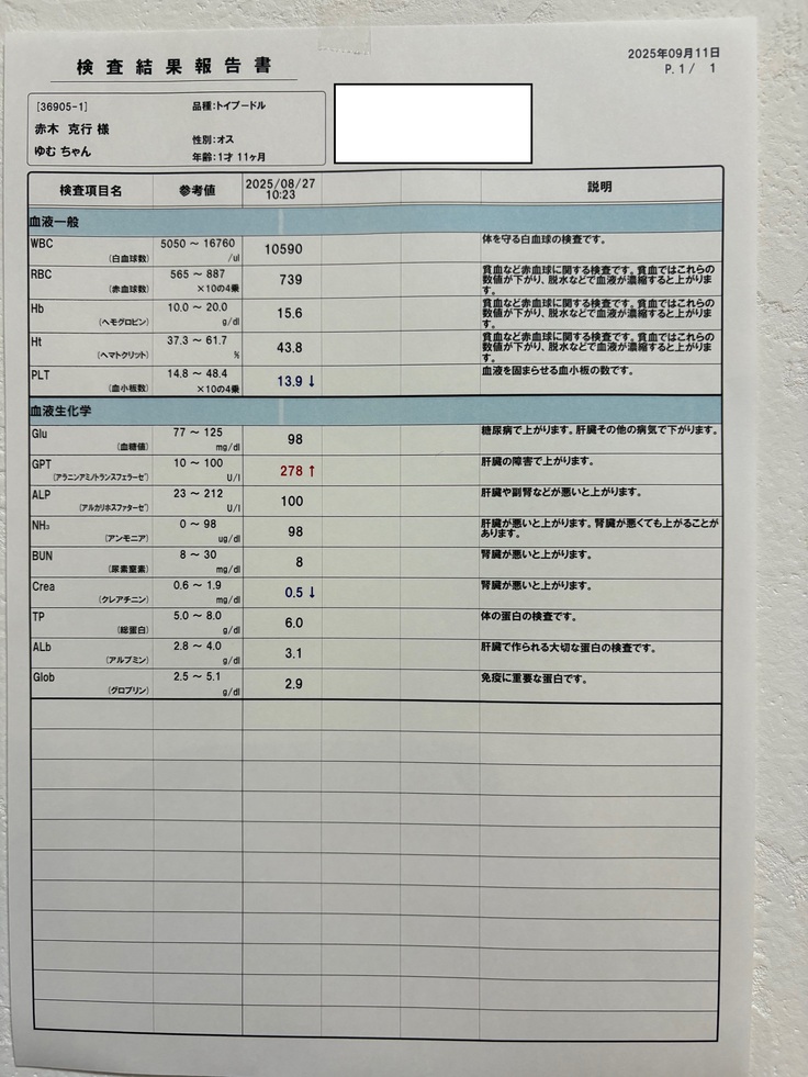 まず血液検査では検査結果としてGPT(アラニンアミノトランスフォーゼ)の値が極めて高く、肝臓に何らかの病気の疑いがあり、またNH₃(アンモニア)の値が正常値範囲の上限の高値で尿路系に何らかの病気の疑いがあるということでした。