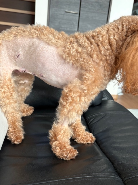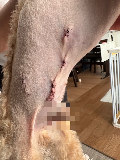 【↑2025.10.10手術から5日経過時、ゆむの闘った証しです※抜糸前です】