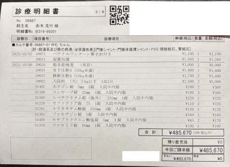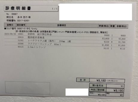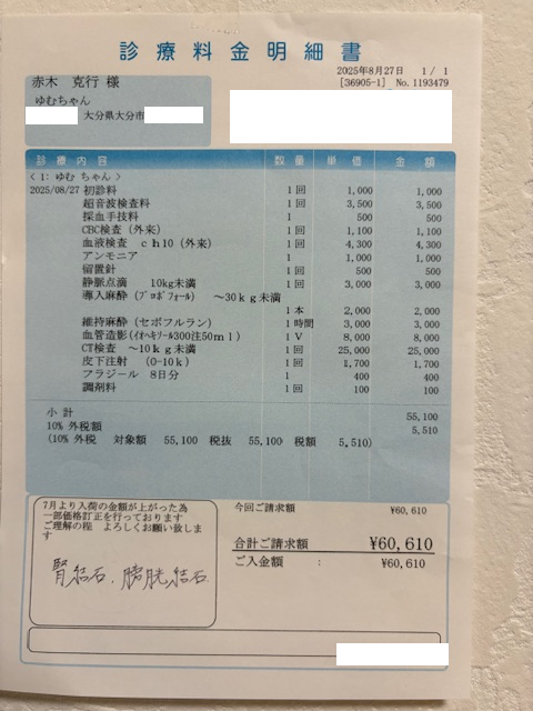 〈2025年8月27日〉別府市のB動物病院では血液検査、超音波検査、さらに全身麻酔下での造影剤を使用したCT撮影をしていただきました。