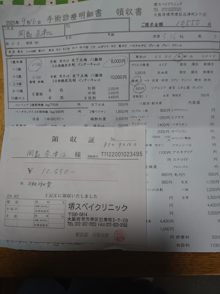 目の炎症もあり施術料2000円と便検査550円をしたため