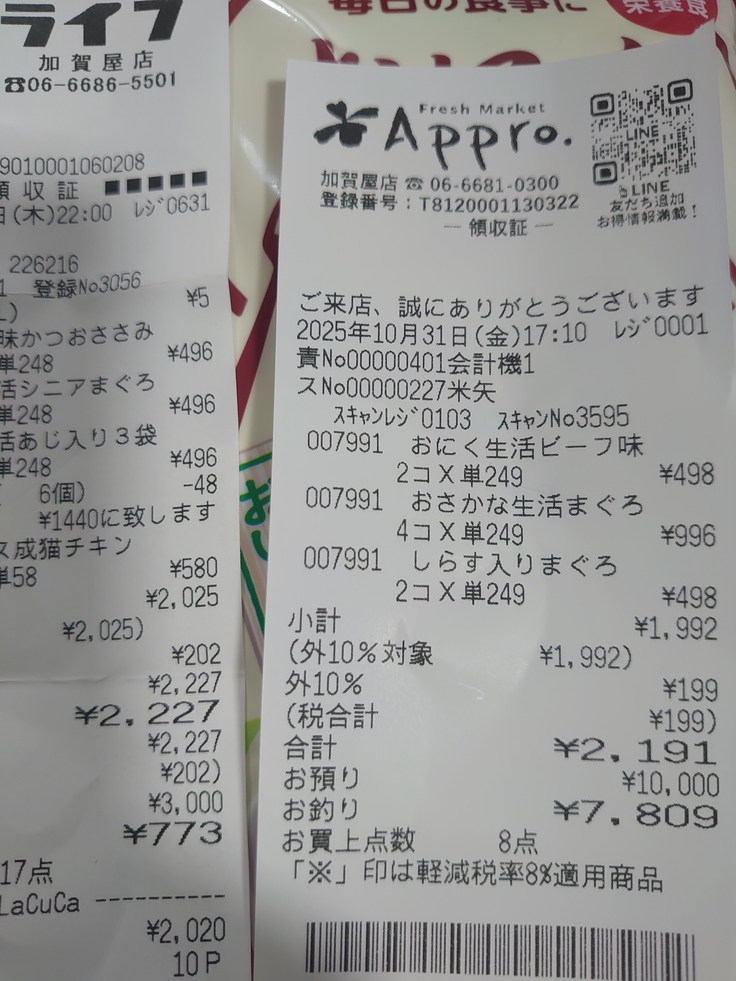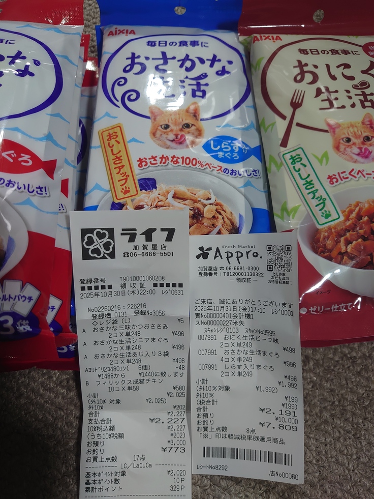 昨日の餌やり中に買ったレシートと